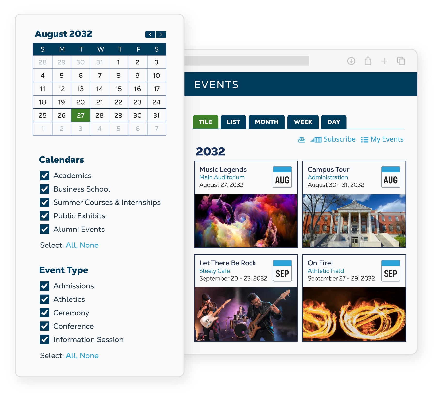 Bring all your organization’s calendars together into one powerful platform. Each department can manage its own events while maintaining a consistent brand and user experience across your entire website.